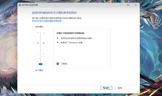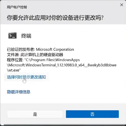- 鼠标右键点击屏幕下方Windows图标——点击终端管理员——点击显示更多详细信息——选择何时显示更改通知——然后点击从不通知——确定