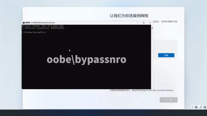 - 正确方式:同时按下【shift+F10】,输入【oobe\bypassnro】,如果该命令无效,可以B站搜索【W11跳过联网】,选择最新发布的