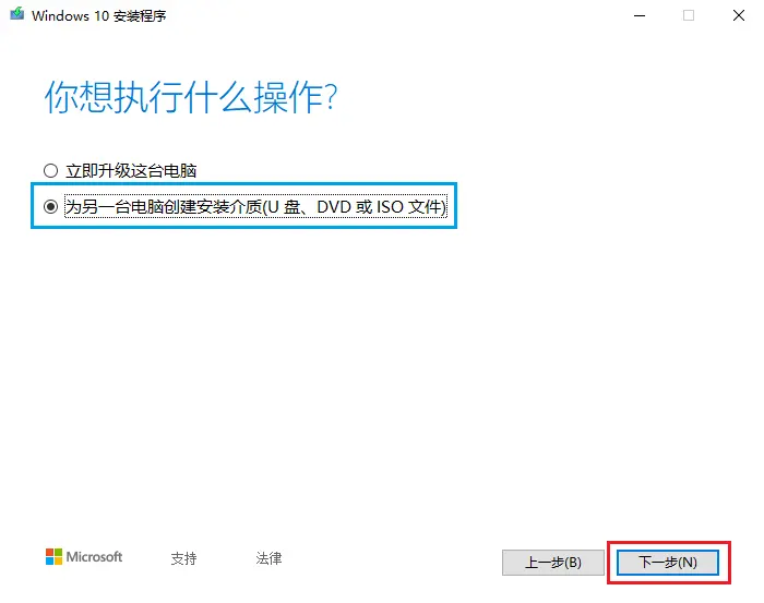 - 这里选择“为另一台电脑创建安装介质”,点击“下一步”。