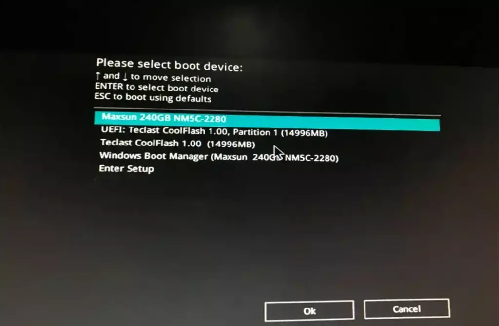 - U盘插上电脑,选择U盘启动,不同主板不一样,“UEFI:+U盘名称”的选项为UEFI模式,这里我选择传统模式安装,也就是只有U盘名称的选项:(Teclast CoolFlash 1.00)