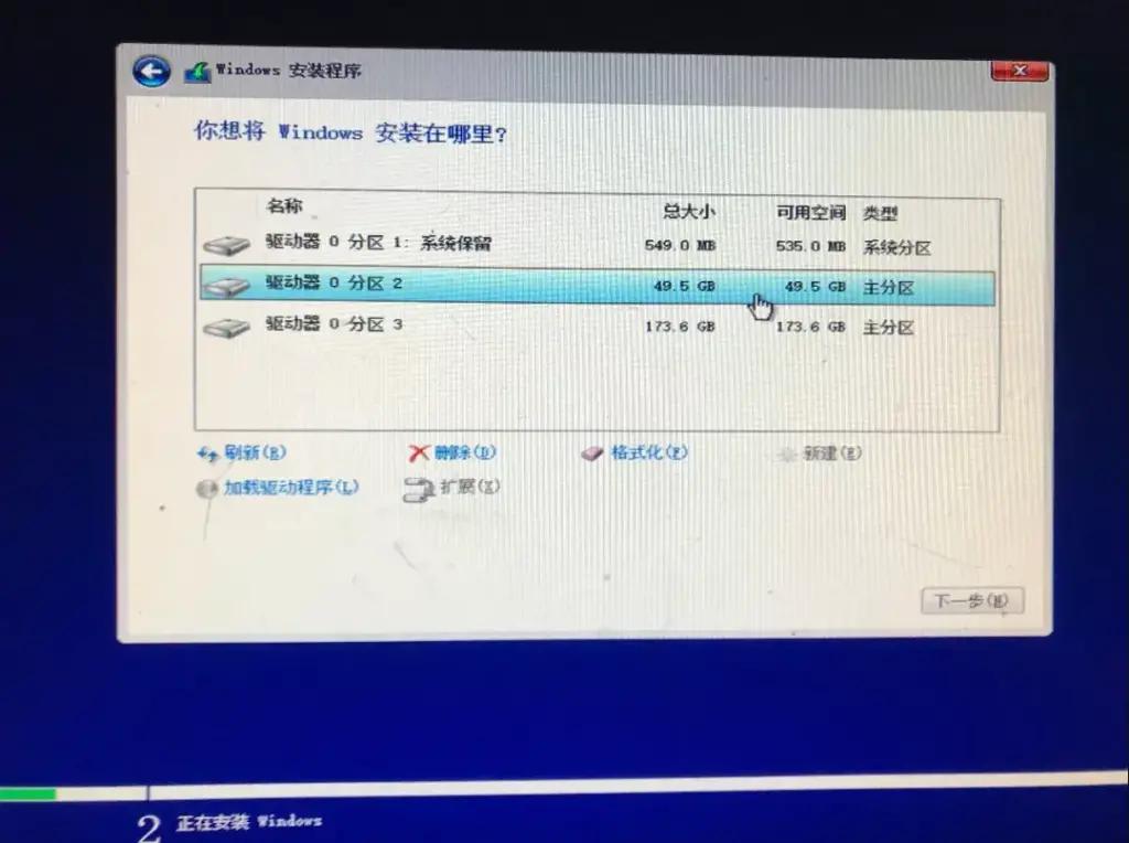 - 新建分区之后会有系统保留的分区和一个主分区,选择主分区下一步就好了