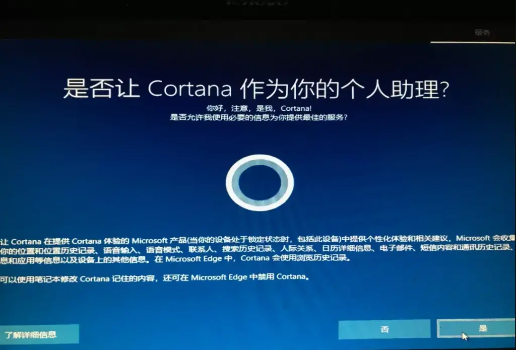 - 个人不喜欢Cortana,所以点“否”(感觉没什么用,还吃系统资源,所以不推荐用)