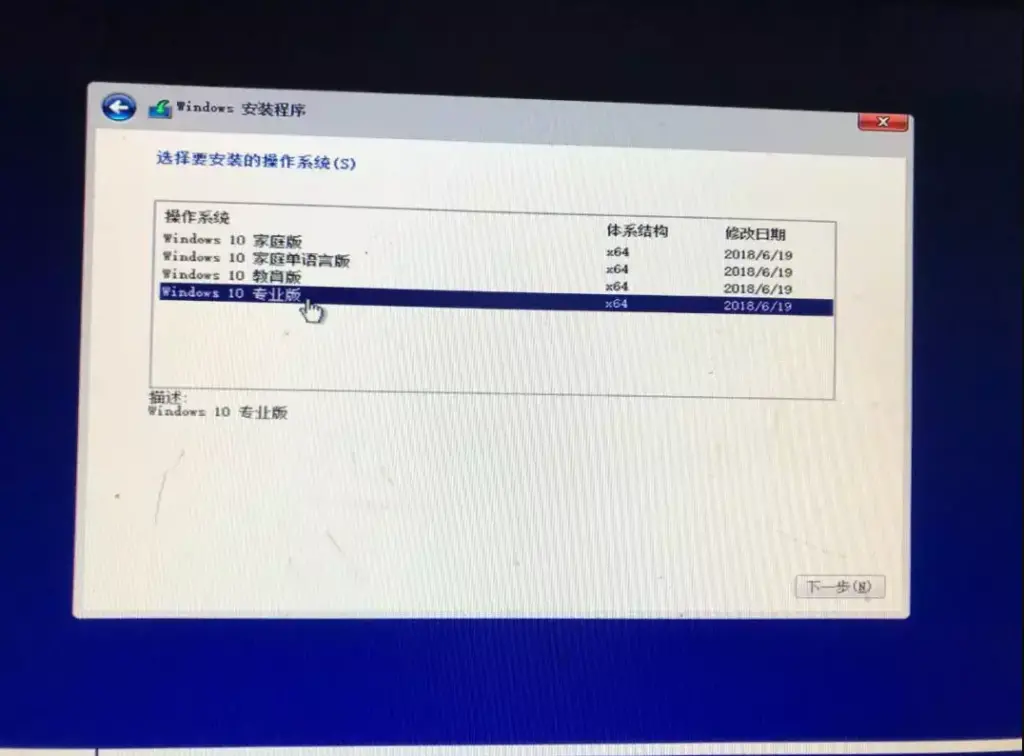 - 选择Windows 10 专业版,下一步(我喜欢用专业版,可以根据自己喜好来选)