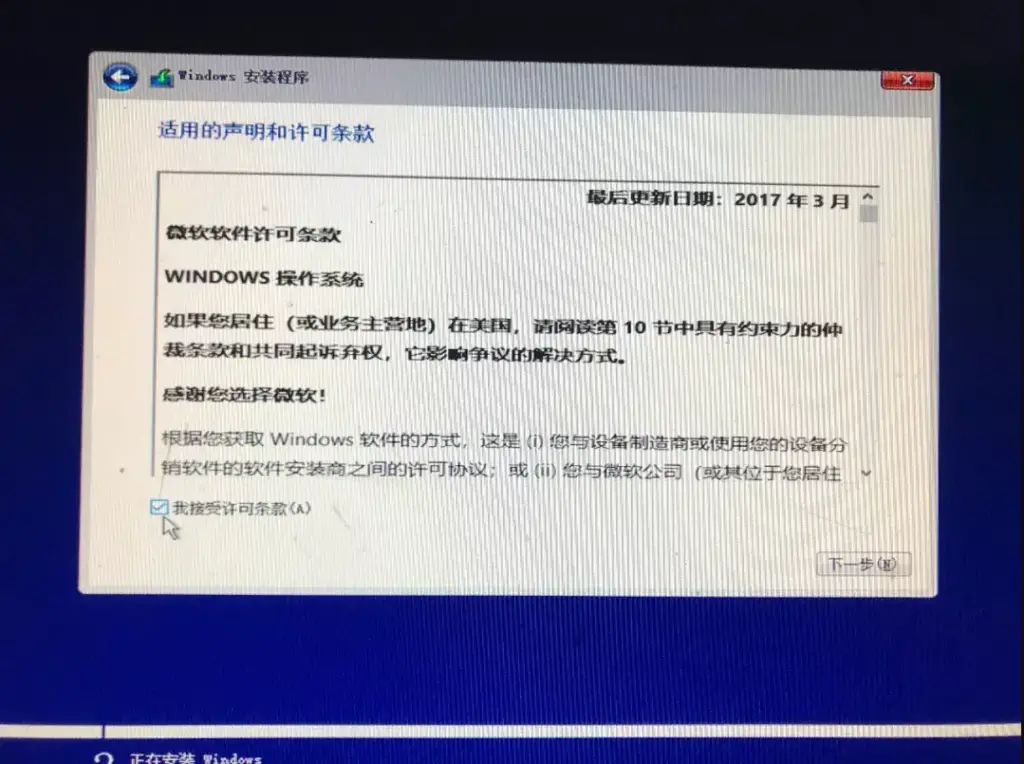 - 勾选我接受许可条款,下一步