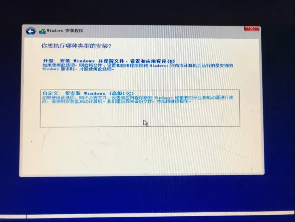 - 选择自定义:仅安装 Windows(高级)