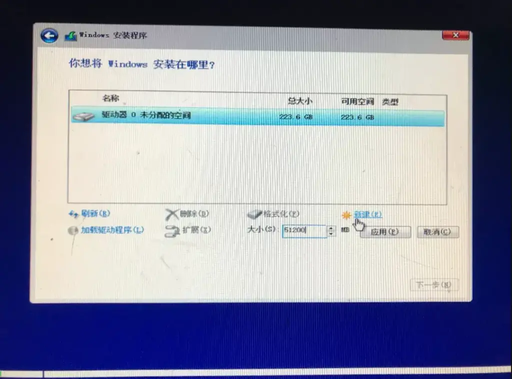 - 这里使用的是一块240G新硬盘,我的个人习惯系统盘不分区(因为我电脑有2块固态,教程这里图片只有一块),新建一个分区做C盘(C盘大小可自行调整),在大小内填入MB数(1G=1024MB)