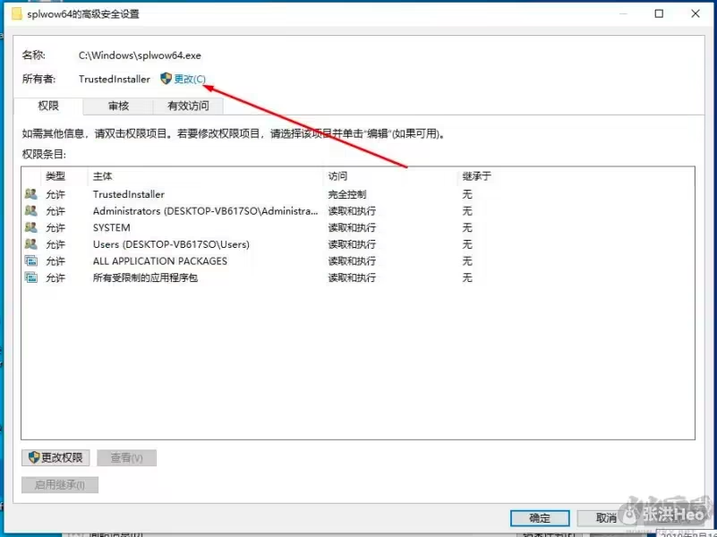 • 此时我们可以看到所有者为Trustedinstaller或者别的,点击更改