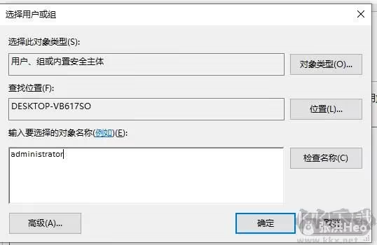 • 输入你当前用户名,我的是administrator,然后点击确定;(不知道的话可以点击高级——查找,选择用户)